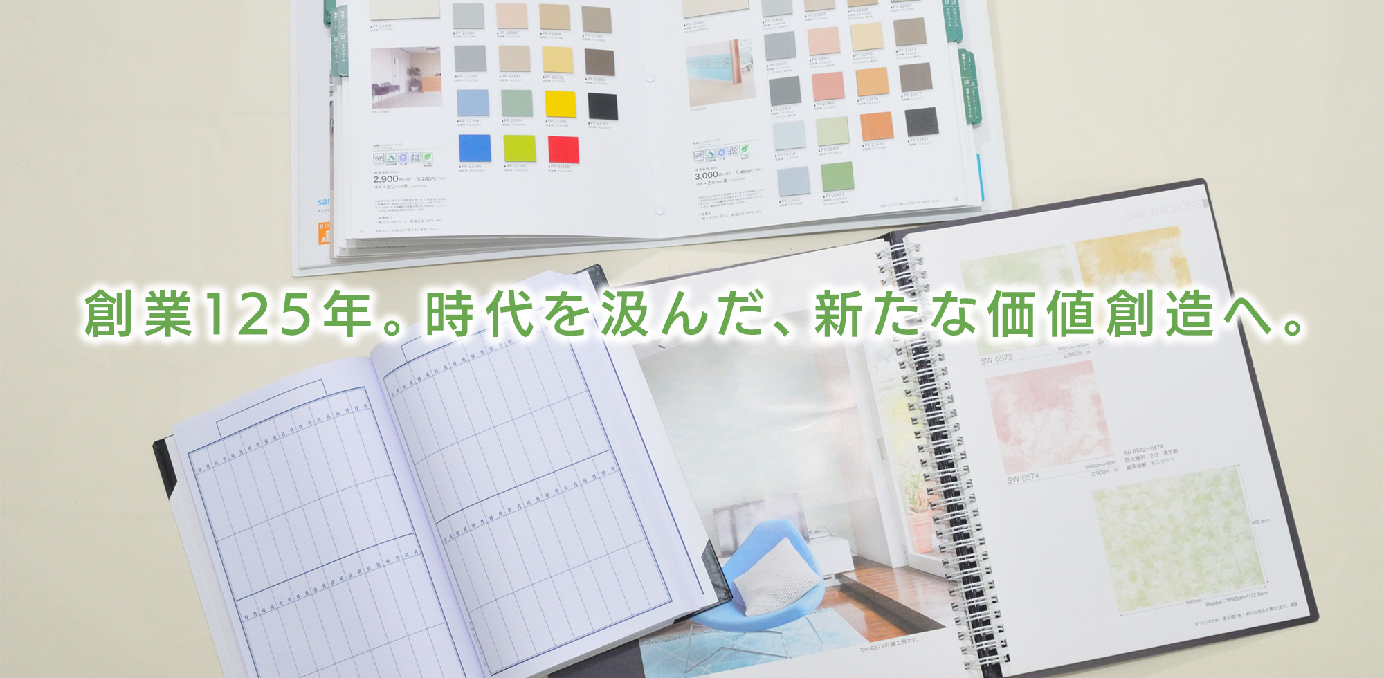 私たちシミズサンプルは、この「見本帳」の製作を手がけています。カーテン、カーペット、壁紙といったインテリア素材、スーツの生地、木材、金属など幅広い素材を加工できる設備体制を強みに、1ページずつ1冊ずつ丁寧に作り上げた製品として、全国のエンドユーザー様へお届けしています。